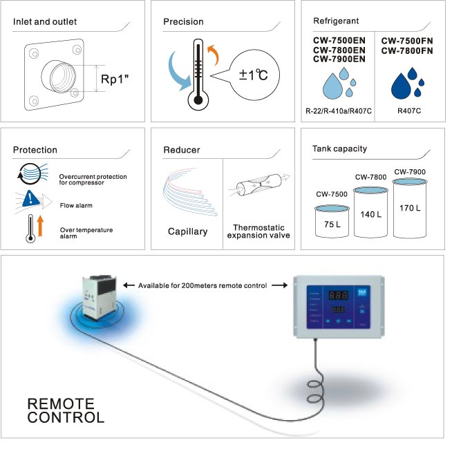 S&A CW-7500 remote control series is high-precision compression refrigeration small Water Chiller, available for remote control, with intelligent temperature control,completed configuration, perfect protection and alarm system. S&A industrial water chillers are popular for its 2 temperature control modes as constant temperature and intelligent temperature control. Under intelligent mode, the water temperature is adjusted according to ambient temperature. With that 1 key solution, customers no longer need to worry about the water temperature adjustment of seasonal changes.