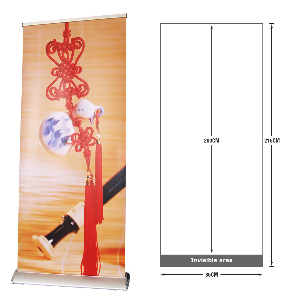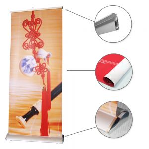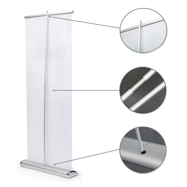 This roll up display stand, also known as a retractable banner system, is ready to set up almost immediately. Just flip out the feet, raise the pole, and lift the banner. This roll up display stand automatically rolls the banner into `the` base for storage and transportation.