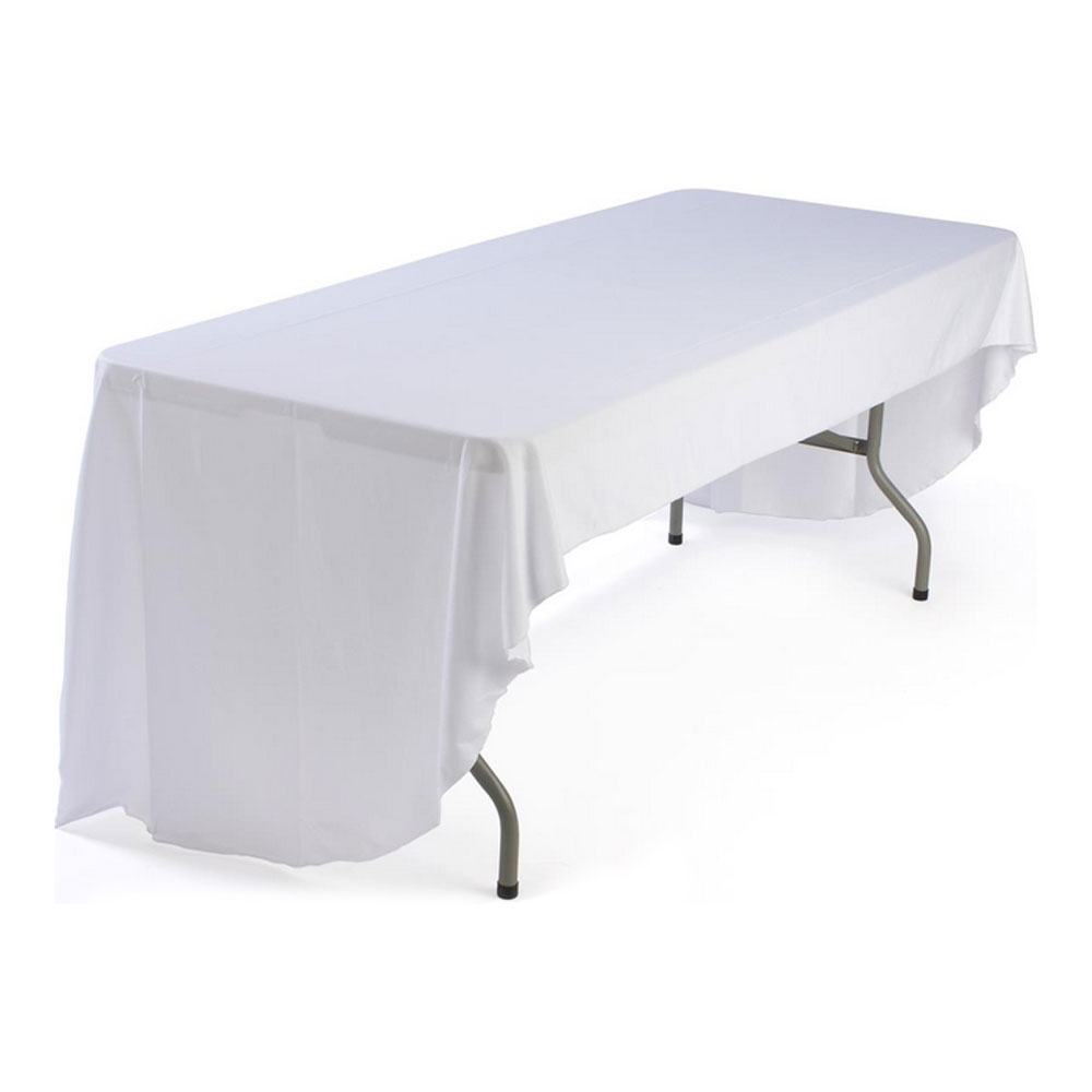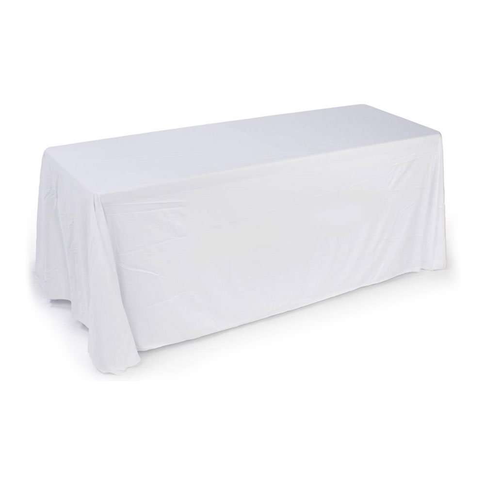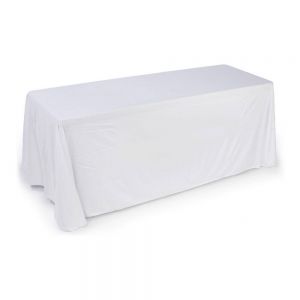 A table throw will compliment any of your tabletop displays and looks especially great under a custom imprinted table runner! This white table cover is made from durable stretch fabric cloth that is meant to last and through future events. The fabric falls within 2" of the floor on 3 sides, and falls 6" down on the back side of the table. This throw cover is sewn with rounded corners on the front corners and has no seam. The fabric is also machine washable and dryable. Your display set-up can be fabulously easy with a tablecloth like this white economy table cover!