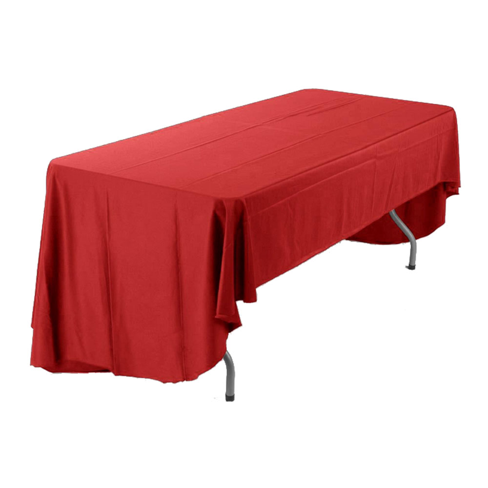 This red 3-sides table cover is designed to be used with a 6' x 30" x 30" table. This table throw hangs over (3) sides of the table, leaving room on one side for a person to easily sit at. The table drape, red 3-sides table cover fabric hangs 2" off the ground when properly aligned, with the back side hanging down 6". A red 3-sides table cover is sewn with rounded front corners, and has no seam. Buy this table cover today for a cost effective way to make your business look great at your next event.