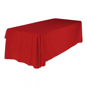 A red 3-sides table throw is made of red stretch fabric cloth. This fabric is durable as well as machine washable and dryable, providing years of use that can easily be cleaned. This red 3-sides table cover is typically used at trade shows, conventions, retail stores, offices, and job fairs to help project a professional appearance. A red 3-sides table throw can be used with a table runner that features your custom logo to really grab the attention of potential patrons!