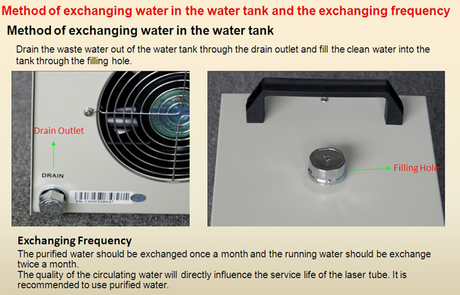 Fill the water tank with purified water. Connect the water inlet of the water tank to the water outlet of the laser machine and connect the water outlet of the water tank to the water inlet of the laser machine. Connect the signal line of the water tank with that of the laser machine. Please see pictures below.
