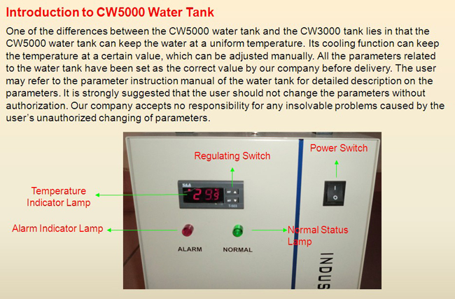 One of the differences between the CW5200 water tank and the cw3000 tank lies in that the CW5200 water tank can keep the water at a uniform temperature. Its cooling function can keep the temperature at a certain value, which can be adjusted manually. All the parameters related to the water tank have been set as the correct value by our company before delivery. The user may refer to the parameter instruction manual of the water tank for detailed description on the parameters. It is strongly suggested that the user should not change the parameters without authorization. Our company accepts no responsibility for any insolvable problems caused by the user’s unauthorized changing of parameters Maintenance