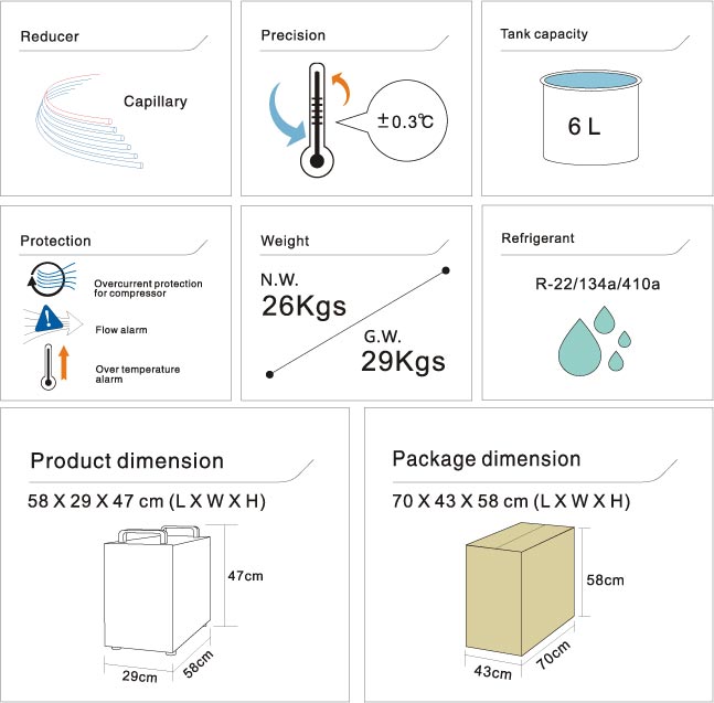 • Multiple alarm functions: compressor time-delay protection, compressor overcurrent protection, water flow alarm and over high / low temperature alarm;