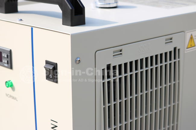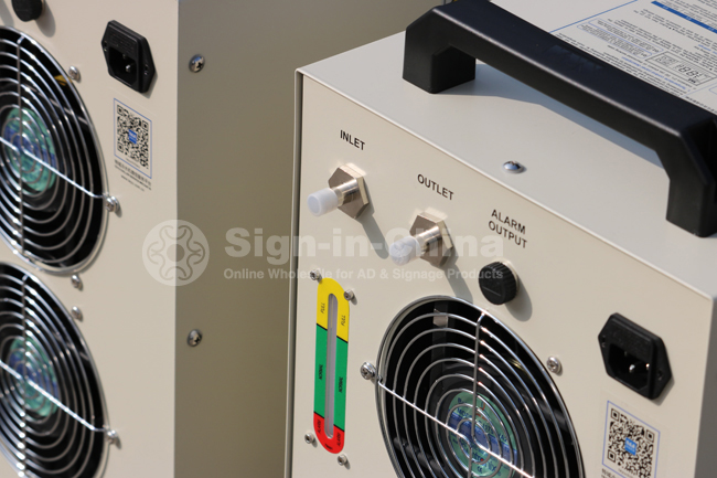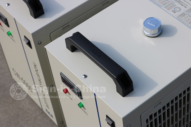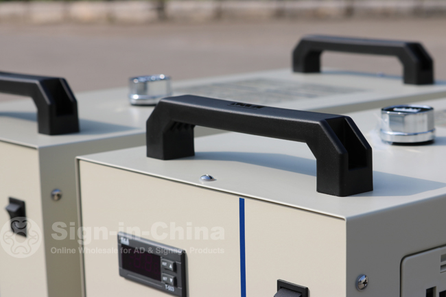 Our CW-5200 is refrigeration type industrial Water Chiller of 1400W cooling capacity. It’s mainly used to have the heat generated during the laser device working that gone through the refrigerating cycle in compressor refrigeration system and eventually transferred to the air. The water temperature is able to be adjusted. There are 2 specifications as 1 water outlet / inlet and dual water outlet / inlet, applicable to cool single laser glass tube.