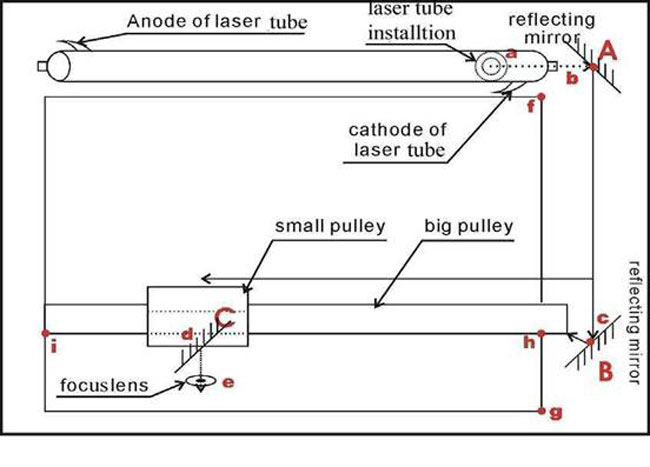Sketch map of Optical system, the laser beam is from laser tube, then reflecting mirrors and focus lens, As following: