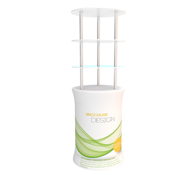 This Rack is a great addition to any trade show presentation. The custom signage goes through a dye-sublimation printing process on high stretch fabric. The resolution is 720 DPI, which results in a brightly colored and detailed exhibit. The stretchy material eliminates wrinkles when pulled taut. This counter is constructed from `an` aluminum tube  that sets up with a snap of a button.