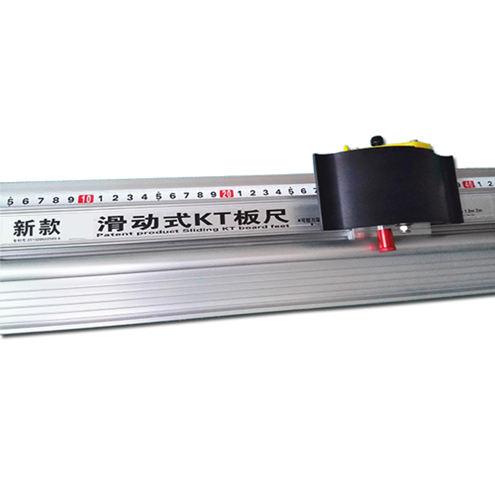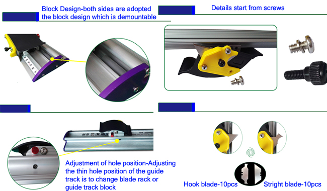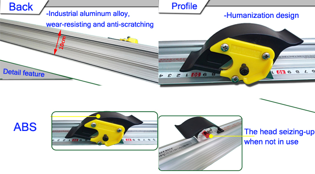 It is a trimmer which combines a ruler and cutter and on which the cutter slides on the ruler for cutting. It can cut thin materials or thicker ones at thickness max 10mm. There are trapezoid blades furnished which can substitute the art cutting blade when it is broke off. Using hook blade can cut PS board or acrylics. There are two anti-sliding strips on the bottom surface of ruler to prevent running deviation. This ruler increases your working efficiency, it is safe and practical, and also prevent cutting hands. The blade is designed with safety lock which locks the blade from moving to make safe.