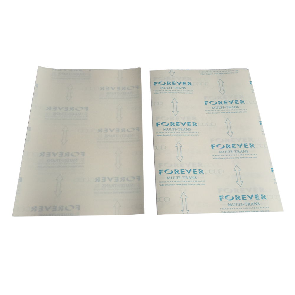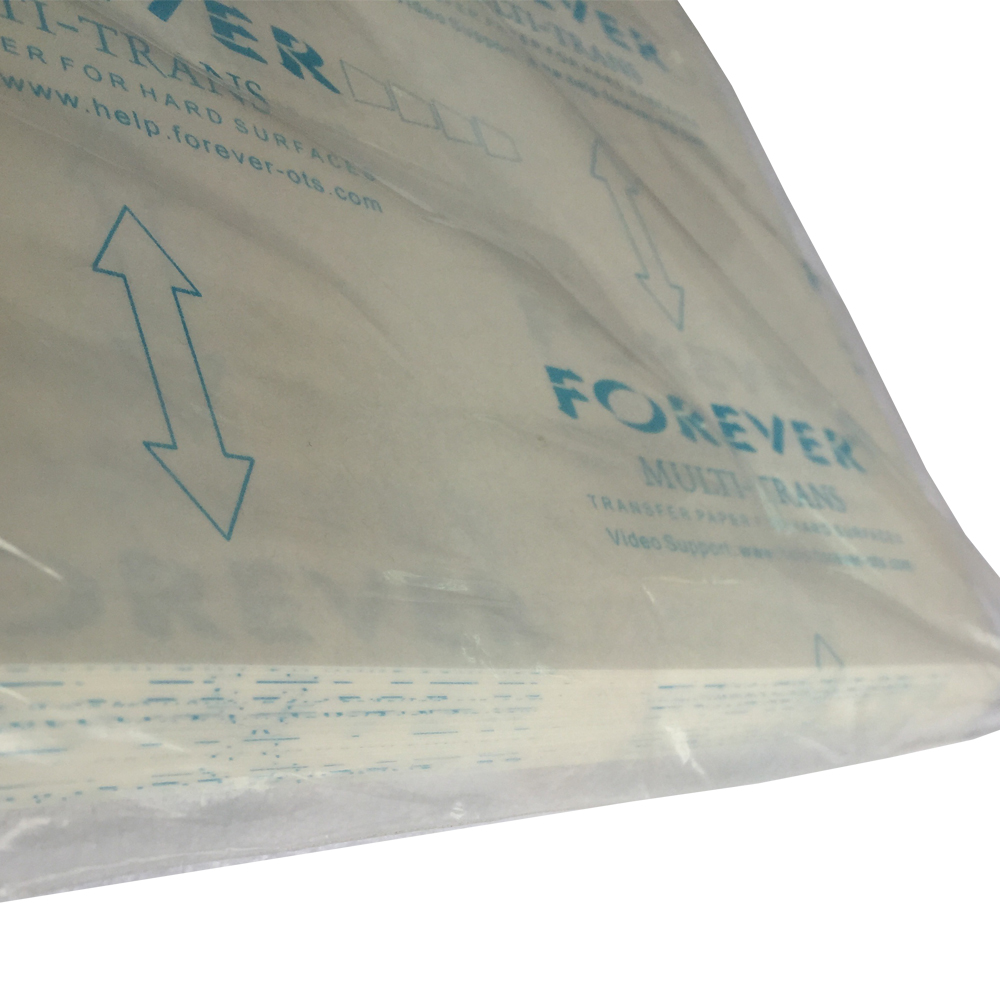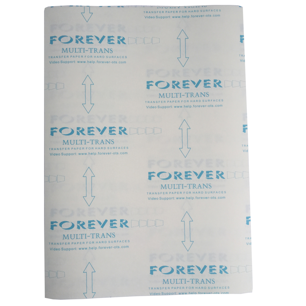 FOREVER Mutil-Trans A4 LASER TRANSFER PAPER HARD SURFACE TRANSFER PAPER-8.5" X 11" is a self- weeding paper for use with most CMYK and CMYW (white toner) LED laser printers. Prints made with Forever Multi-Trans laser transfer paper can be applied to almost any hard surface that you can fit under your heat press and that can with stand pressing temperatures of up to 300°F.