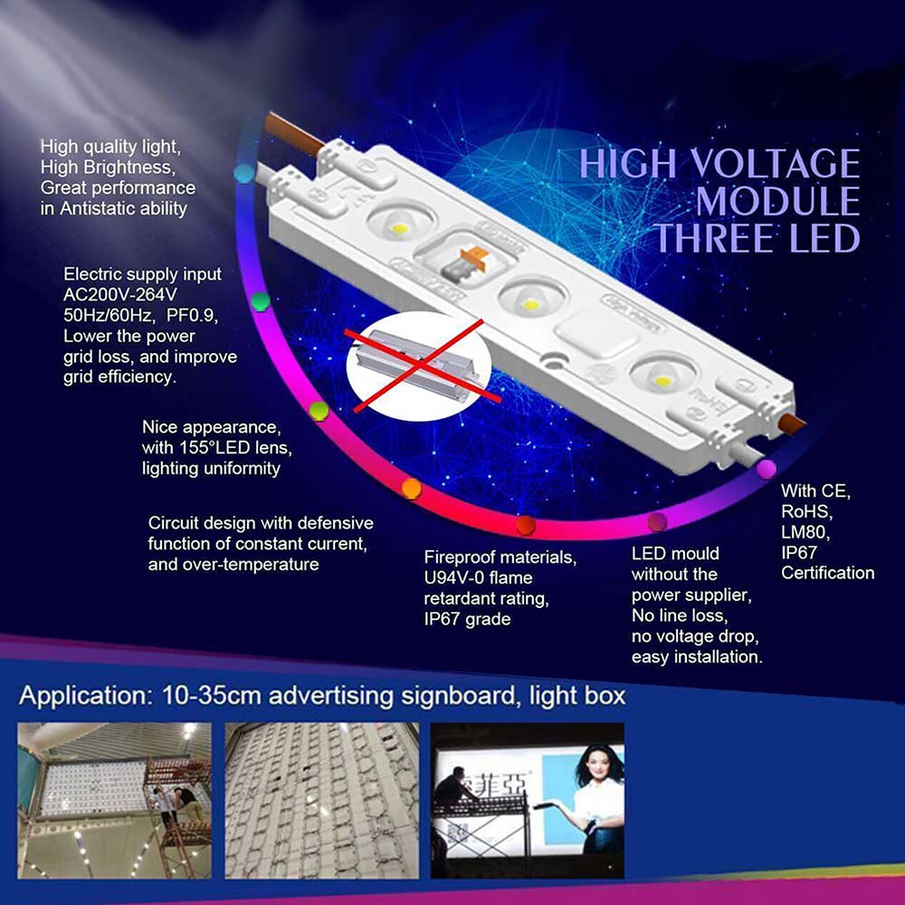 1. Module single lamp can be cut, the work of AC voltage: AC100, AC110V, AC220V, 50/60HZ.