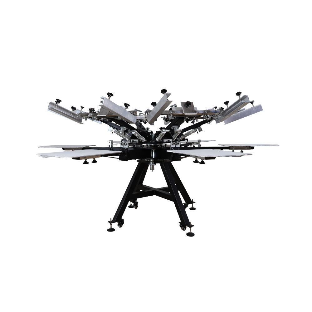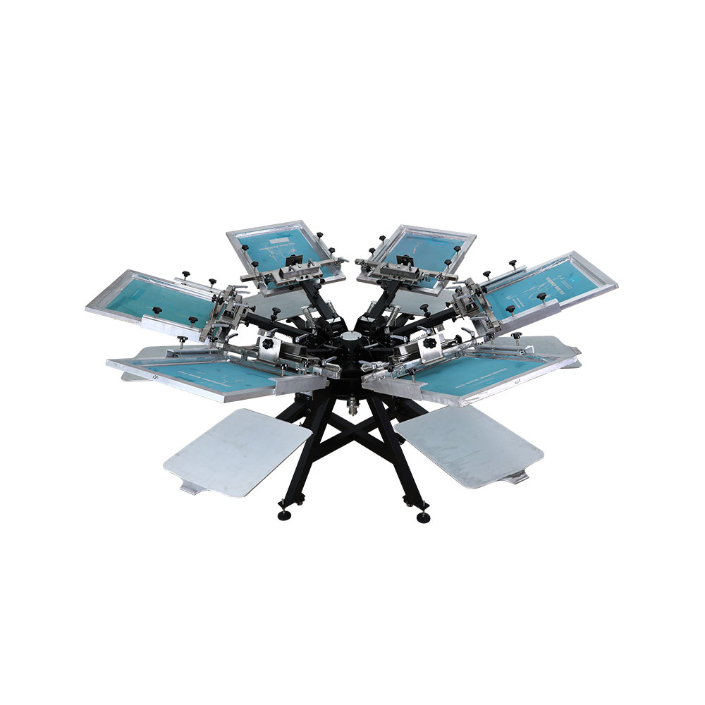 All our screen printing machines and spot dryers are proudly hand made in China. On our carousel screen printing machines, the screens rotate allowing you to select the next color and so on. On the larger machines (e. g. 4, 6 and 8 color floor standing machines), the print beds also rotate independently of the screens. This is important because as your print one color, you need to rotate the t-shirt (whilst still on the board) underneath the spot dryer to cure the ink before you apply the next color on top.