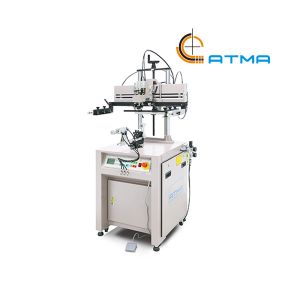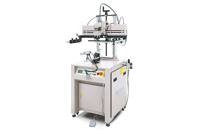Initially invented pneumatic mini curve screen printer, suitable for printing industrial product like cosmetic container, glass or cup / mug, syringe, measurement cup, golf club, etc.