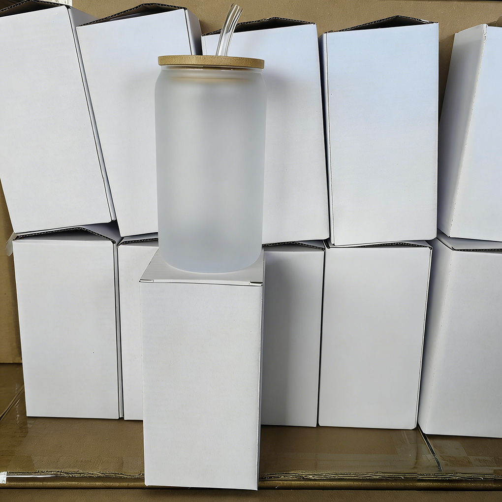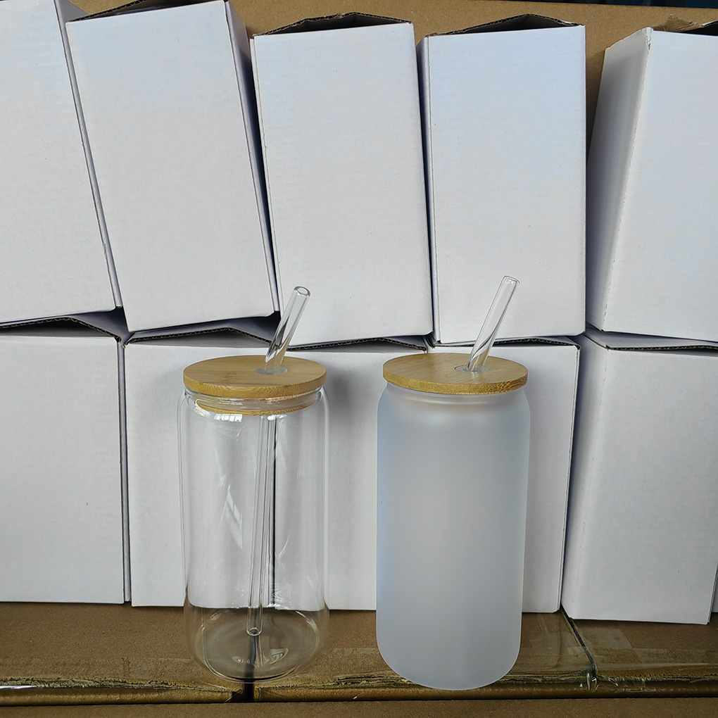 CALCA 48 Pack 16oz Sublimation Frosted Glass Mug Blanks - Beer/Coke Can Style Cups with Bamboo Lid & Glass Straw