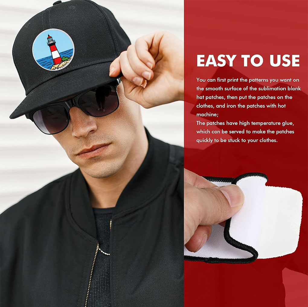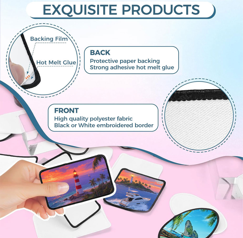 1.These Self Adhesive patches are made of polyester fabric with sublimation material on the front and strong hot adhesive on the back for easy application and ironing; On the edge, we use black thread to make the lock design, the patch looks more prominent, style more classic.