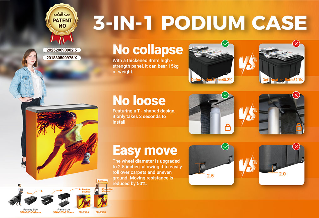 This multi-functional foldable advertising display stand ticks all the boxes for your needs! It serves as both a sleek exhibition showcase and a practical storage solution—keep your products organized while putting them on prominent display. Equipped with 360° swivel casters, it’s effortlessly portable, letting you move it around your booth with zero hassle. Beyond utility, its modern design adds a polished, eye-catching touch to your exhibition space, elevating your brand presence without breaking the bank. A cost-effective all-in-one solution for impactful displays!
