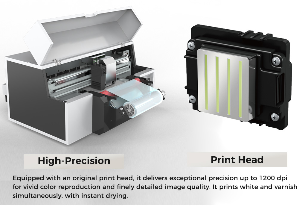 1. Equiped with the original import stable and durable Print Head, the highest accuracy up to 1200dpi, high color reproduction and, delicate picture quality; white color and varnish at the same time, dry immediately.
