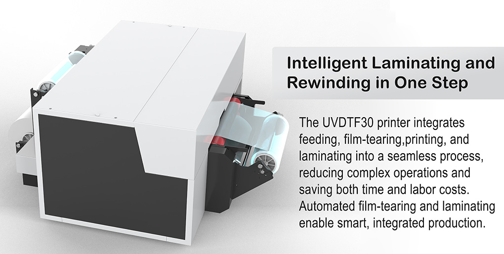 2. UVDTF30 printer can feed, tear film, print, laminate all in one, reduce complicated operation, save time and labor costs. Automatic film-tearing and laminating realizes integrated intelligent production.