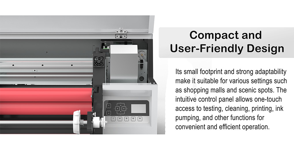 4. Small size, strong adaptability, suitable for shopping malls, scenic spots and other scenes. Intelligent control panel design, one click to complete the test, cleaning, printing, ink filling and other functions, convenient and efficient.